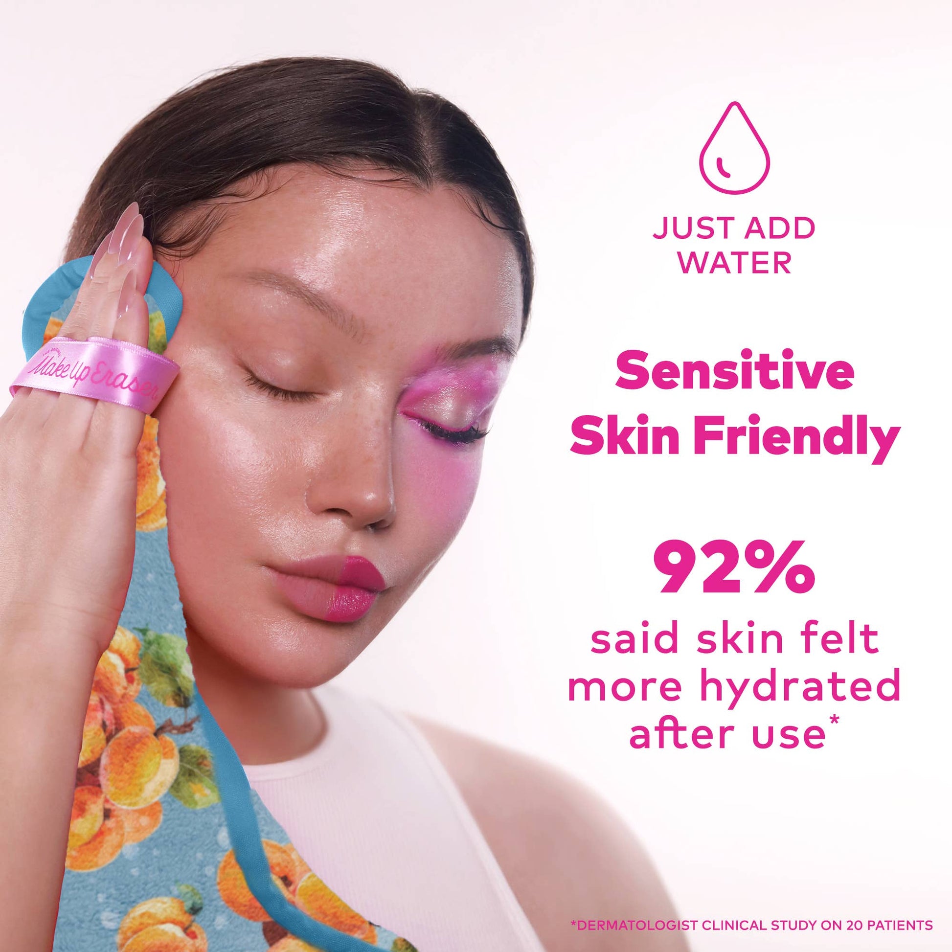 Erase all makeup with JUST WATER™ including waterproof. Our patented, water-activated, cloud-soft fibers gently & easily remove all makeup & sunscreen from pores. 2 in 1 benefit: one side erases makeup & one side exfoliates skin.