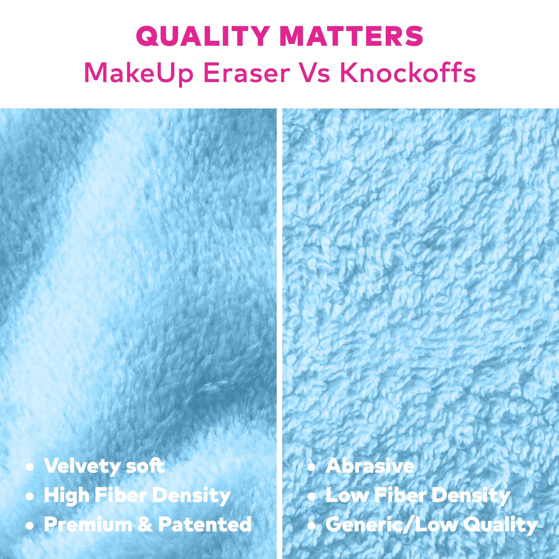 MakeUp Eraser is powered by SmartErase™ Technology, featuring unique cross-section microfibers engineered for efficient makeup removal using electrostatic forces, & enhanced when wet. This innovation also allows for easy stain removal with machine washing.
