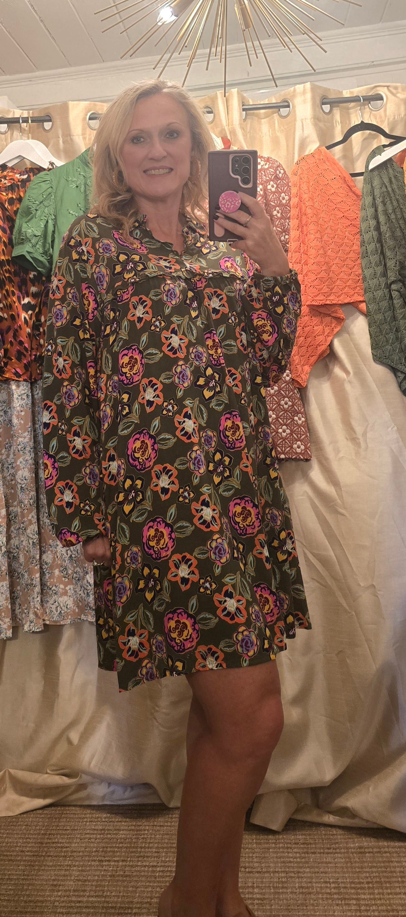 Pretty fall flowers on a hunter green background adorn this fall dress.