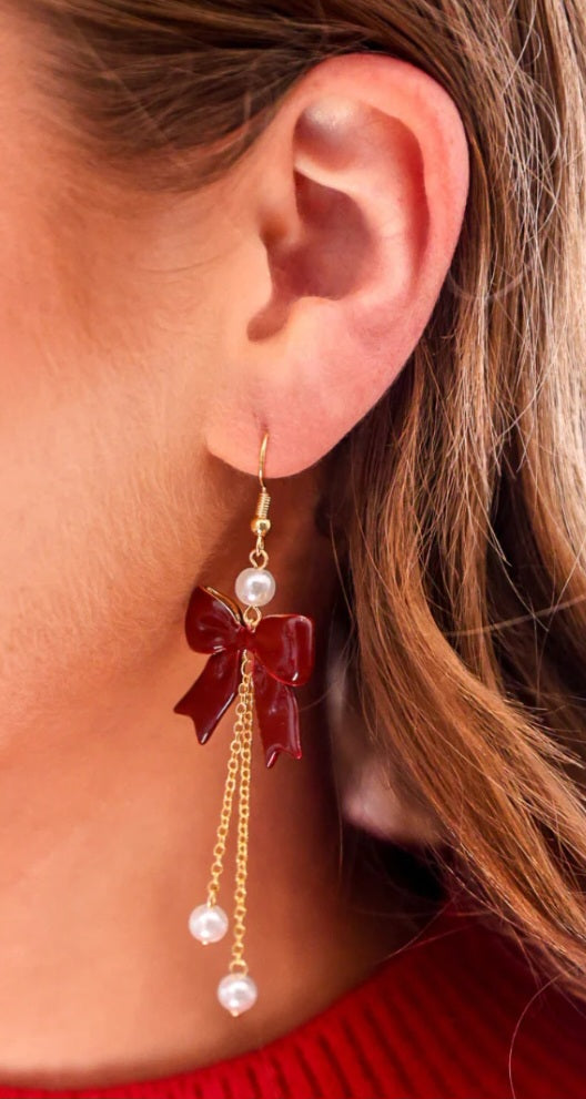 This dainty, drop earrings features small pearls and a burgundy bow.