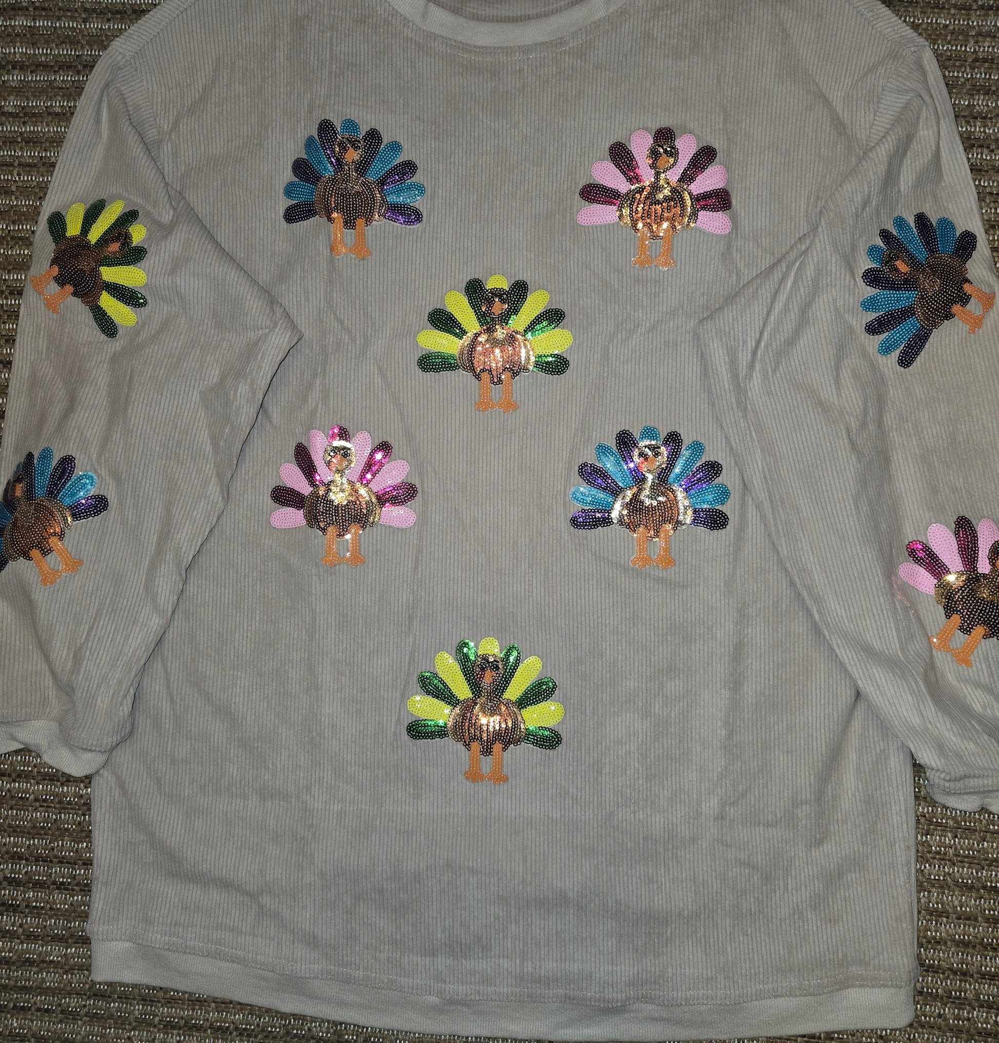 Corded pullover with sequin, multi colored turkeys all over the front.